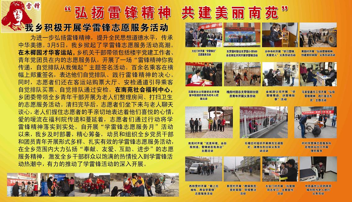 南苑村开展“优美环境,由你我创造,雷锋就在我身边”主题活动 成立了一支由党员、团员及群众在内的学雷锋志愿服务队,建立了“学雷锋基地”。组织100多名服务队员对村域内的35亩绿地进行清理,清理建筑垃圾10余车。