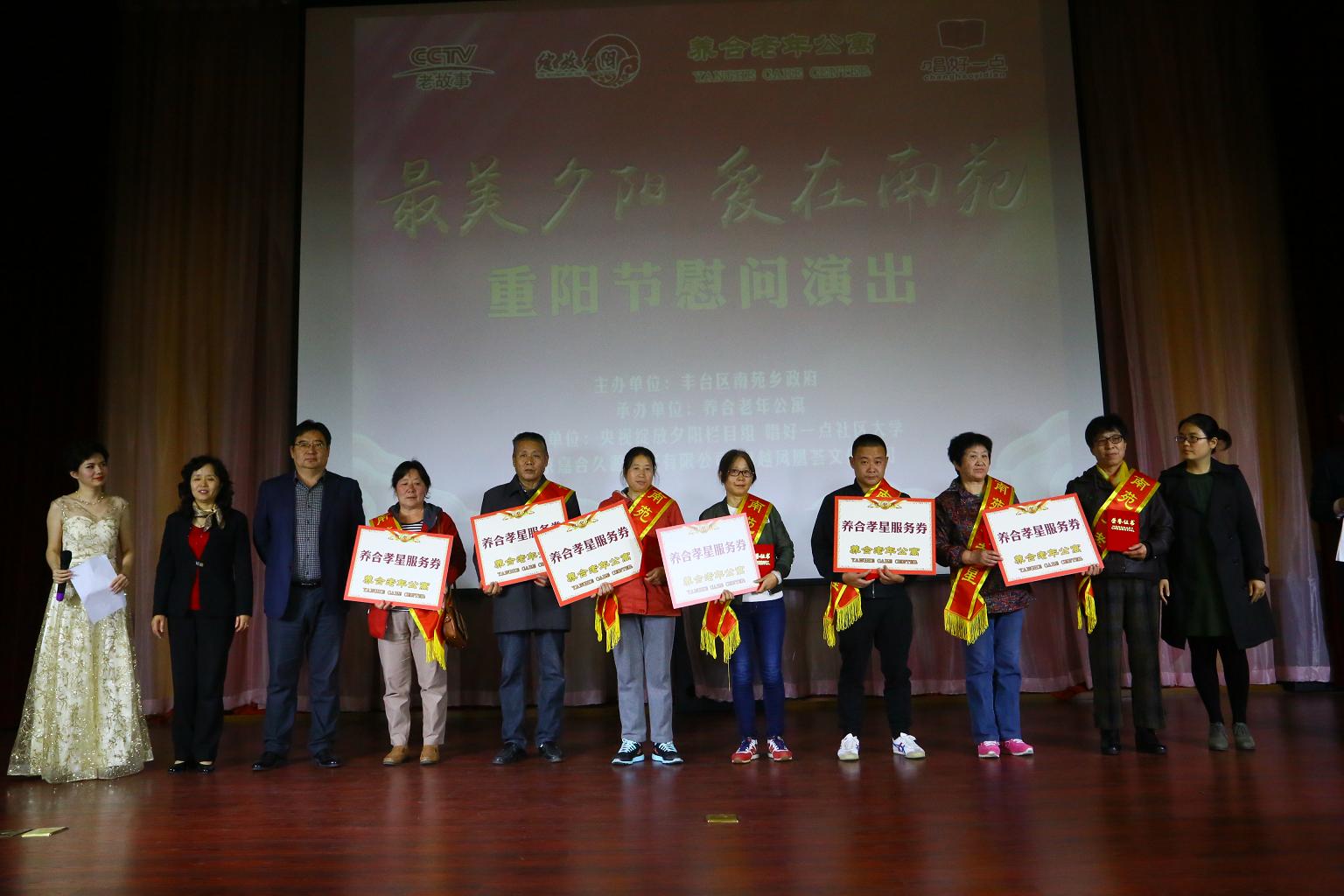 10月26日上午九点半,《“最美夕阳、爱在南苑”文艺演出暨南苑乡孝星表彰》活动在大红门村礼堂举办,乡纪委书记徐振平出席活动并致辞、副乡长孔媛媛、副处级调研员张桂云代表出席活动。本次活动由南苑乡政府主办,大红门养合老年公寓承办,旨在表彰我乡34名乡级“孝星”,同时也为社区老人及居民奉献一场精彩的文艺盛宴,本次活动规格较高,从策划到正式演出历时一个半月,并且邀请到央视老故事频道《绽放夕阳》栏目组及“唱好一点”社区大学共同参与,演职人员达到100余名,西城区民政局等多家单位到场观摩。